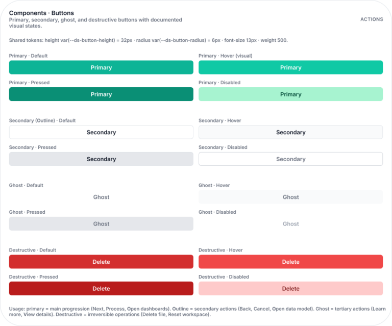 Specified states for all key elements (default, hover, active, disabled, loading, error) to remove ambiguity.